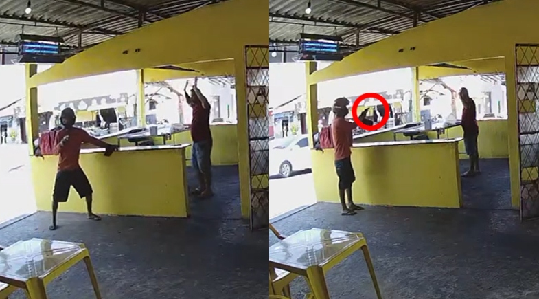 Conforme as imagens, eram 12h53, quando um suspeito, de capacete, entra no local já com uma arma de fogo nas mãos. Ele chega a mira do revólver em direção a todos que estão na espetaria - tanto clientes quanto um atendente.