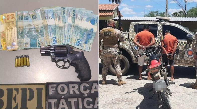 Os presos foram identificados pelas iniciais A.J.S.B, de 35 anos, com duas passagens por furto qualificado, e M.V.C, de 42 anos. Além da arma e dos veículos, os policiais apreenderam R$ 2.082 em espécie.