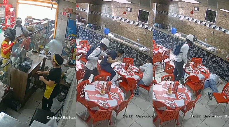 Na área principal, em um momento de distração, uma das vítimas consegue correr e escapar. No outro local, o assaltante chega a agredir as costas de um homem e o derruba em seguida.