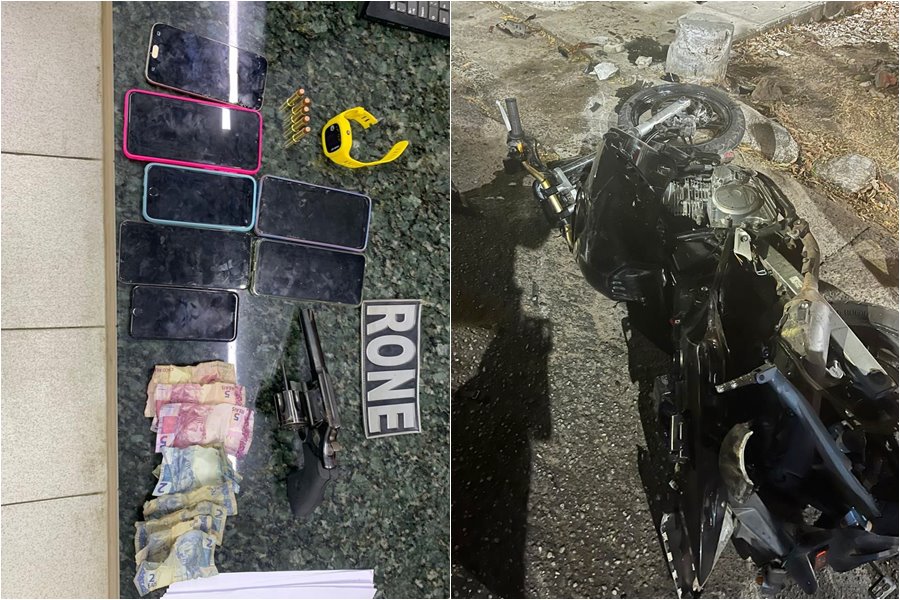 Mais adiante, a dupla perdeu o controle da motocicleta e colidiu com um obstáculo de concreto na avenida Noé Mendes. Após o acidente, os policiais realizaram a abordagem e verificaram que a motocicleta possuía restrição de roubo/furto. Durante a revista, foram encontrados em posse dos suspeitos sete celulares roubados, um revólver calibre 38, cinco munições calibre 38, um relógio de pulso e R$ 27,00 em espécie.