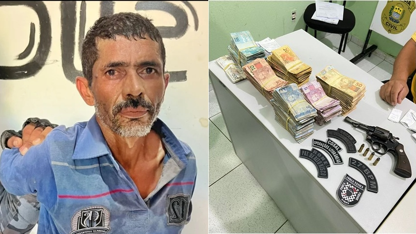 O QUE OCORREU: Nesta segunda-feira, 1º de abril, o 27º Batalhão de Polícia Militar do Piauí foi informado de um assalto próximo ao banco. Na ocasião, testemunhas relataram o ocorrido e informaram sobre a localização do sujeito. No endereço apontado, as equipes realizaram um cerco e abordaram o suspeito, Gilberto. Ele foi preso em posse de uma arma de fogo e uma mochila contendo o dinheiro roubado, sendo R$ 99.604,90 (13 cédulas de 200 reais; 494 cédulas de 100 reais; 585 cédulas de 50 reais; 562 cédulas de 20 reais; 400 cédulas de 10 reais; 369 cédulas de 5 reais; 550 cédulas de 2 reais).