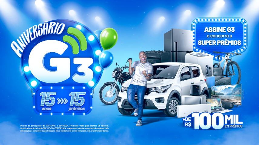 A G3 Telecom, empresa líder em telecomunicações no Piauí, completa 15 anos de história e para celebrar essa data especial, está lançando uma campanha imperdível para seus clientes. São 15 prêmios incríveis para você: 1 carro 0km, 1 moto 0 km, geladeira, televisão e muito mais.