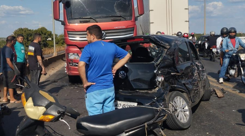 Uma colisão envolvendo um carro de passeio e um caminhão deixou uma mulher ferida, na tarde desta quarta-feira (12), na “Ponte do Tancredo Neves”, que liga as zonas Sul e Sudeste de Teresina.