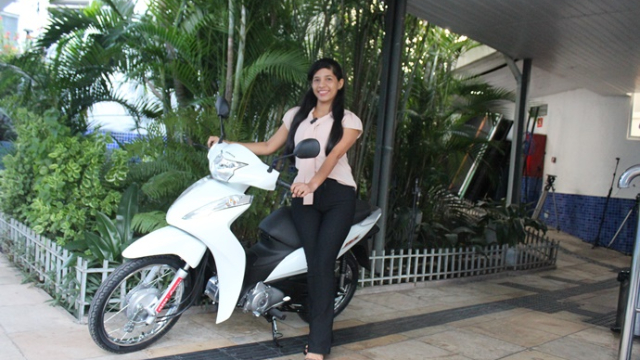 Ganhadora da moto 0 Km da 8° edição do Assine Ganhe recebe prêmio./ Jéssica Dayane