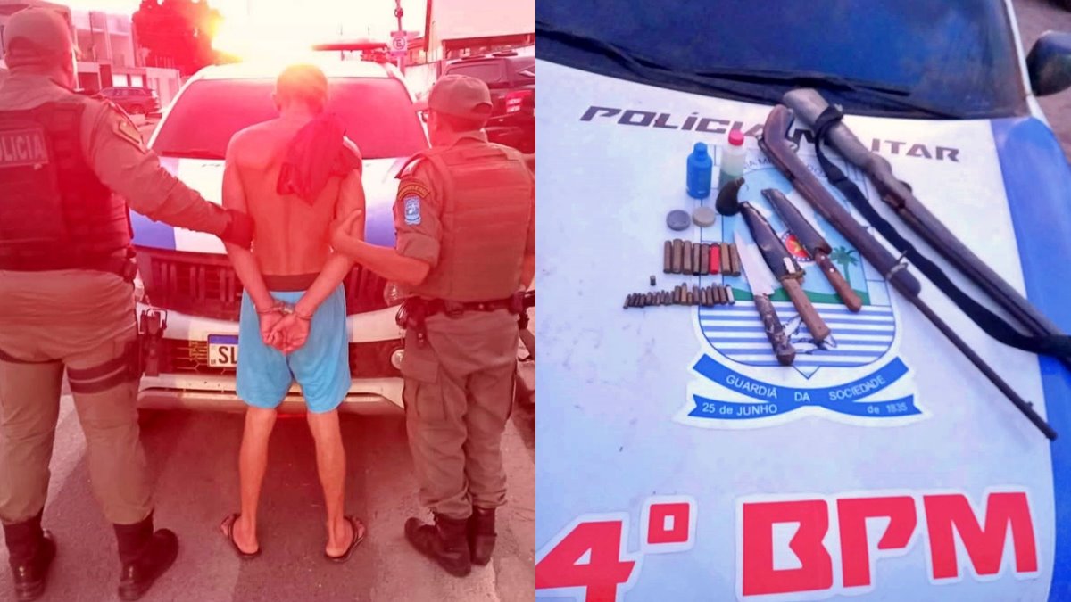 A PM afirmou que o acusado usava arma de fogo para as ameaças e na averiguação no interior da casa, após autorização da vítima, foram encontradas duas espingardas e várias munições intactas de diversos calibres, além de centenas de cartuchos deflagrados de diferentes calibres, acessórios e armas brancas.