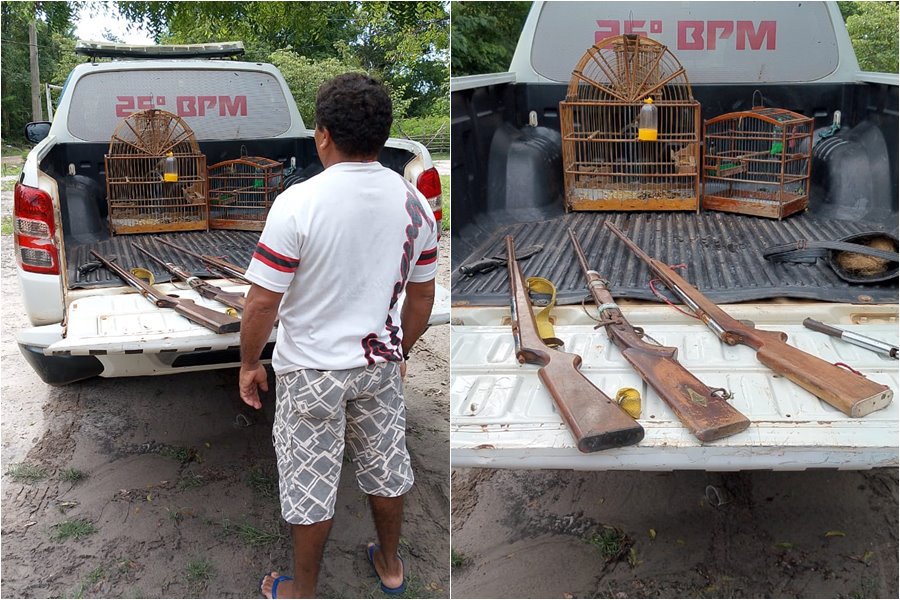 Homem é detido com três espingardas e animais silvestres em cativeiro no norte do Piauí | Foto: Divulgação/PMPI