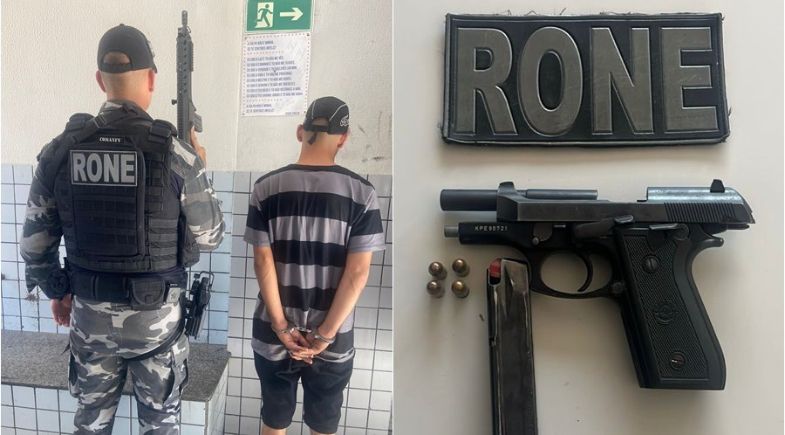 Um homem de 25 anos, identificado apenas pelas iniciais V.M.T.S.C, foi preso no fim da manhã de domingo (17), no bairro Matadouro, zona Norte de Teresina, por porte ilegal de arma de fogo. A prisão foi realizada por uma equipe da RONE (Rondas Ostensivas de Natureza Especial).