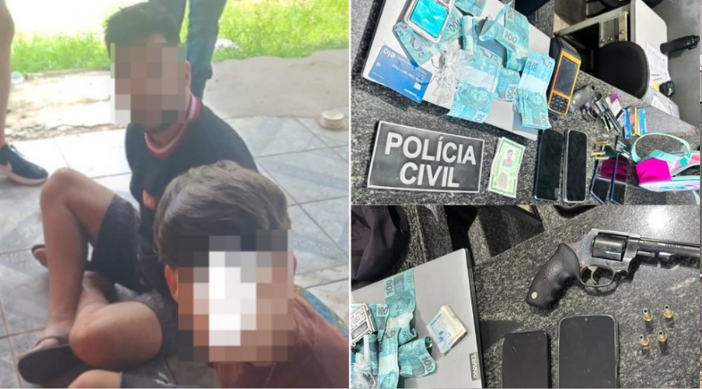 Após o crime, os indivíduos foram localizados sob a posse de um revólver calibre 38, dois celulares, um notebook e cédulas falsas de dinheiro.