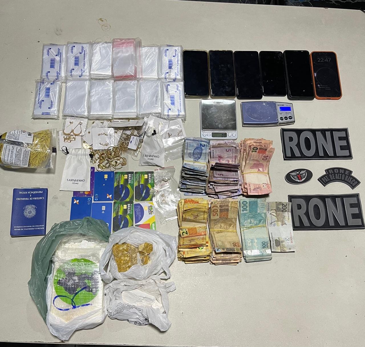 Na casa, o Rone encontrou duas balanças de precisão, 17 pacotes de sacos de abalagem, 17 embalagens com joias; pasta base de cocaína; seis celulares e $ R$ 8.618,60 em dinheiro trocado.