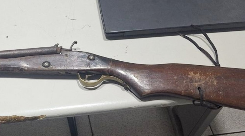 A Polícia Militar foi acionada via Copom para atender uma ocorrência de violência doméstica. No local, a guarnição encontrou o acusado visivelmente alterado, portando uma espingarda tipo bate-bucha e dois facões.