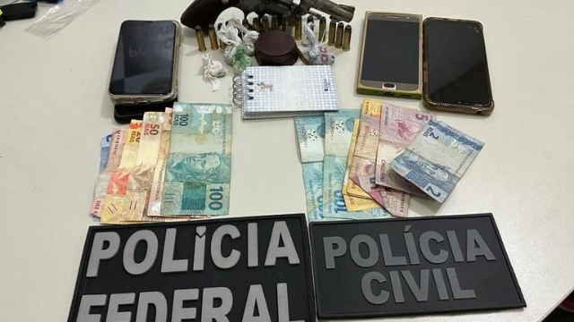 Conforme a Polícia Federal, durante a ocasião foram encontrados um revólver calibre 38 e munições, dinheiro em espécie, aparelhos celulares, uma caderneta com a contabilidade do tráfico, além de certa quantidade de entorpecentes, que serão identificados por meio de exame pericial.