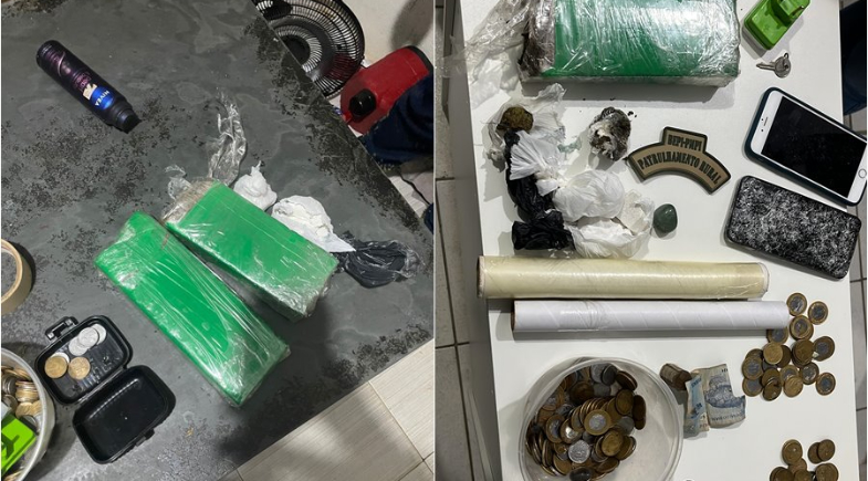 Conforme o relatório policial, por volta das 21h, durante o cumprimento de um mandado de busca, as forças de segurança realizaram diligências no bairro Bola de Ouro, onde encontraram no interior de uma residência dois tabletes de substância análoga à maconha, duas sacolas com cocaína e dinheiro trocado, caracterizando o crime de tráfico de entorpecentes.