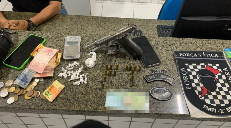A Força Tática do 2º BPM, prendeu em flagrante, na noite de domingo (3), um homem por tráfico de drogas e porte ilegal de arma de fogo de uso restrito no bairro Baixão, em Ilha Grande.