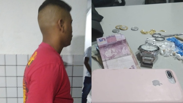 Segundo informações, os agentes passavam em uma viatura pela Avenida Joaquim Nelson, quando alguns suspeitos começaram a correr em fuga. Os policiais então correram atrás e conseguiram capturar apenas um deles. Com o preso foram encontradas 17 pedras de crack, porções de cocaína, 1 trouxa de maconha, 1 cigarro de maconha, R$ 31 em dinheiro, 1 colar, 1 relógio e 1 iPhone com restrição de roubo.