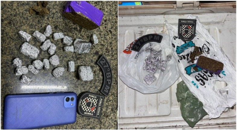Dentro do recipiente, os policiais encontraram entorpecentes em quantidade compatível com o tráfico, confirmando a denúncia de que a droga estava sendo mantida com o auxílio do menor.