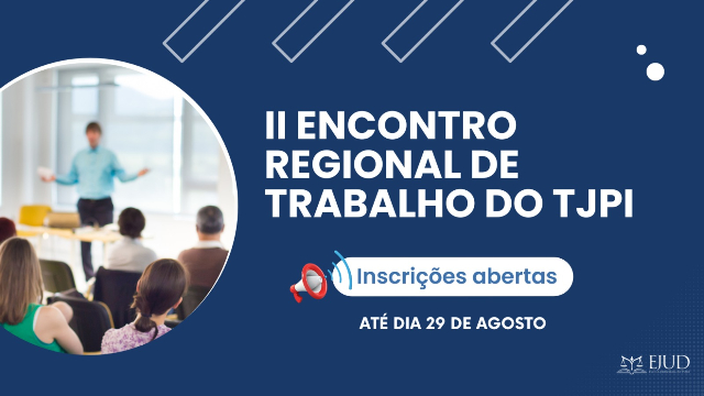 As inscrições para o II Encontro Regional de Trabalho do Tribunal de Justiça do Estado do Piauí estão abertas e vão até a próxima terça-feira (29).  O evento acontece nos dias 27,28, e 29 de setembro em Parnaíba. Para fazer a inscrição, basta acessar o site oficial da EJUD, na aba Cursos.