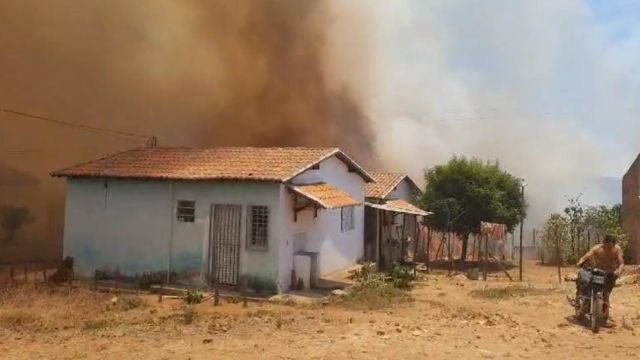 “O fogo chegou perto mesmo, vai acabar com tudo aqui. Chega meu Deus. O fogo já está pegando na cerca, os animais correndo, as pessoas correndo. Meus Deus, agora o fogo está pegando em uma das casas. Misericórdia senhor”, narra um dos moradores que assiste a tudo e não pode fazer nada.