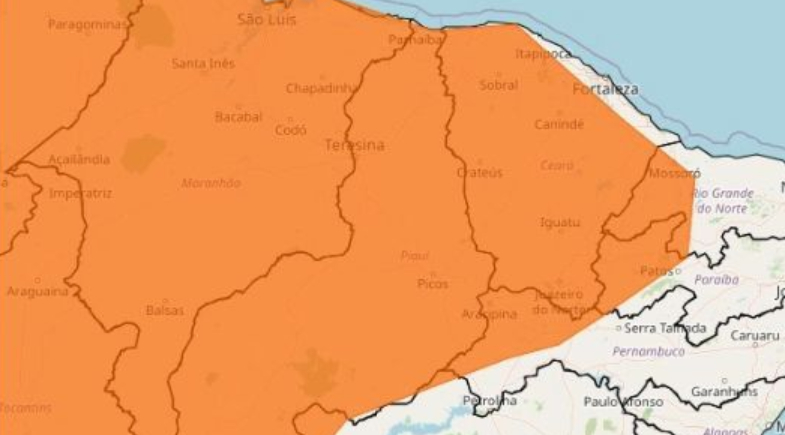 De acordo com o aviso, há previsão de precipitações entre 30 e 60 mm por hora, podendo chegar a 100 mm por dia, acompanhadas de ventos fortes, com velocidades entre 60 e 100 km/h. No Nordeste, o alerta abrange todo o território do Piauí, Maranhão e Ceará, além de atingir cidades do Rio Grande do Norte, Paraíba, Pernambuco e Bahia.
