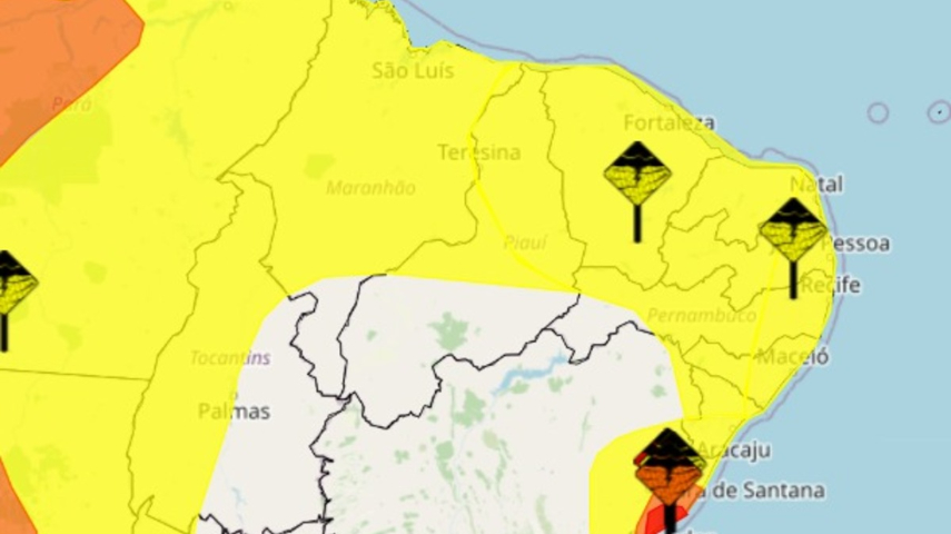 Os municípios sob o alerta amarelo também estão sujeitos ao risco moderado de interrupção no fornecimento de energia elétrica, queda de galhos de árvores, alagamentos e ocorrência de descargas elétricas.