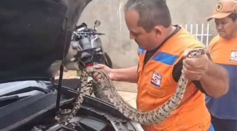 Segundo o órgão, moradores avistaram o animal circulando pela rua e entrando em uma residência. A equipe foi acionada e, ao chegar ao local, constatou que a cobra havia se abrigado no compartimento do motor de um automóvel estacionado no imóvel.