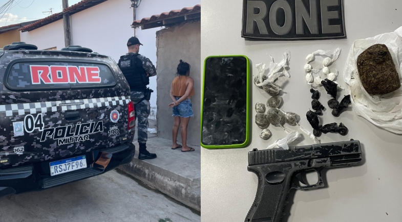 De acordo com a Polícia Militar, a mulher, identificada pelas iniciais L. S. L. S., foi flagrada com drogas e um aparelho celular com restrição de roubo. Com ela, os policiais apreenderam uma porção de maconha, 10 trouxinhas da mesma substância, 15 trouxinhas de cocaína, além de um simulacro de arma de fogo.