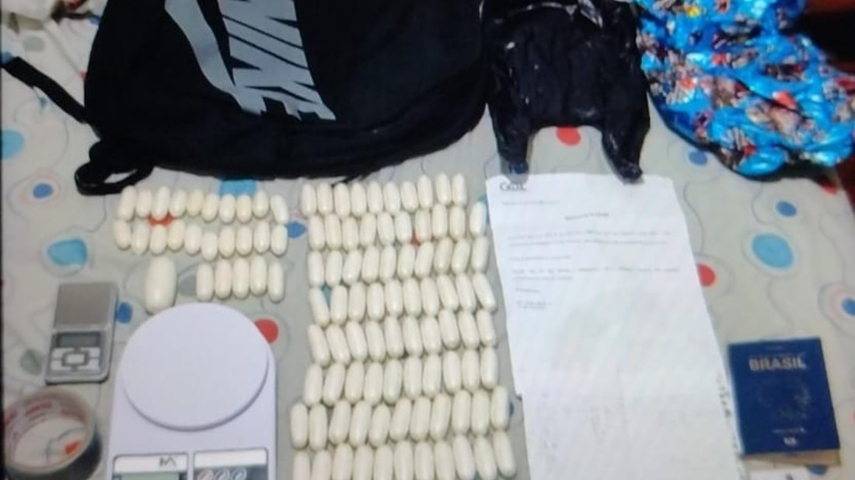No local, foram encontradas 119 cápsulas com cocaína, no formato em que são engolidas pelas “mulas do tráfico”, além de anotações, duas balanças de precisão, um passaporte, além de outros elementos conexos ao crime de tráfico de drogas.