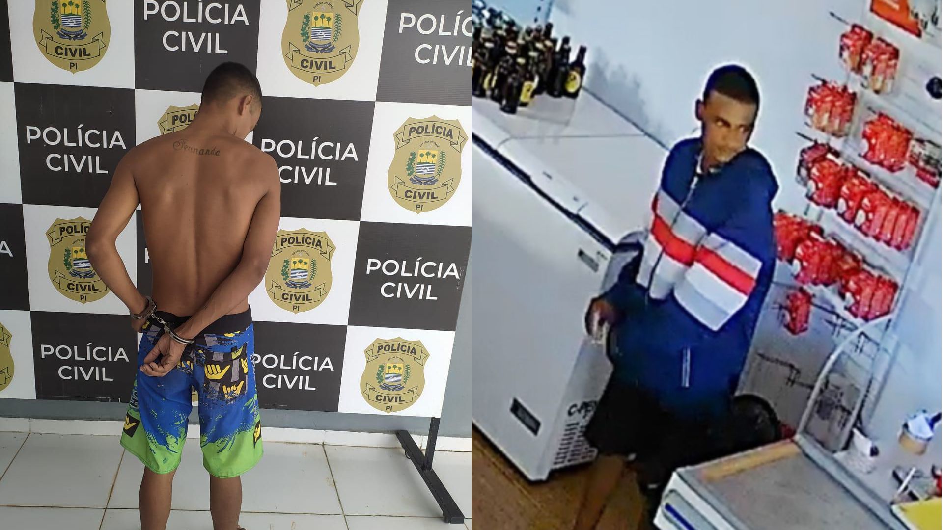 Um jovem identificado pelas iniciais E.D.C.M, suspeito de realizar um assaltar um comércio no Povoado Lagoa Seca, zona rural de Esperantina, no último sábado (08), foi preso na tarde deste domingo (09). Uma câmera de segurança registrou o momento em que o criminoso, de 19 anos, chega ao local disfarçado de cliente.