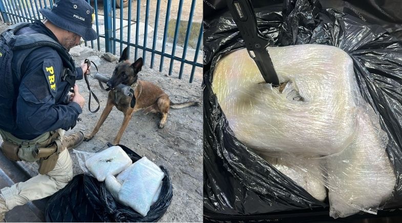 Segundo a Polícia Rodoviária Federal (PRF), a droga foi encontrada embalada dentro de uma mala.Com o apoio do cão farejador K9, especialista na detecção de entorpecentes, foram encontrados 10 tabletes de maconha, pesando 10,482 kg.