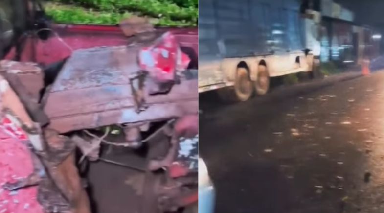 Colisão entre caminhão de cerveja e picape aconteceu sob forte chuva; veículo invadiu residência