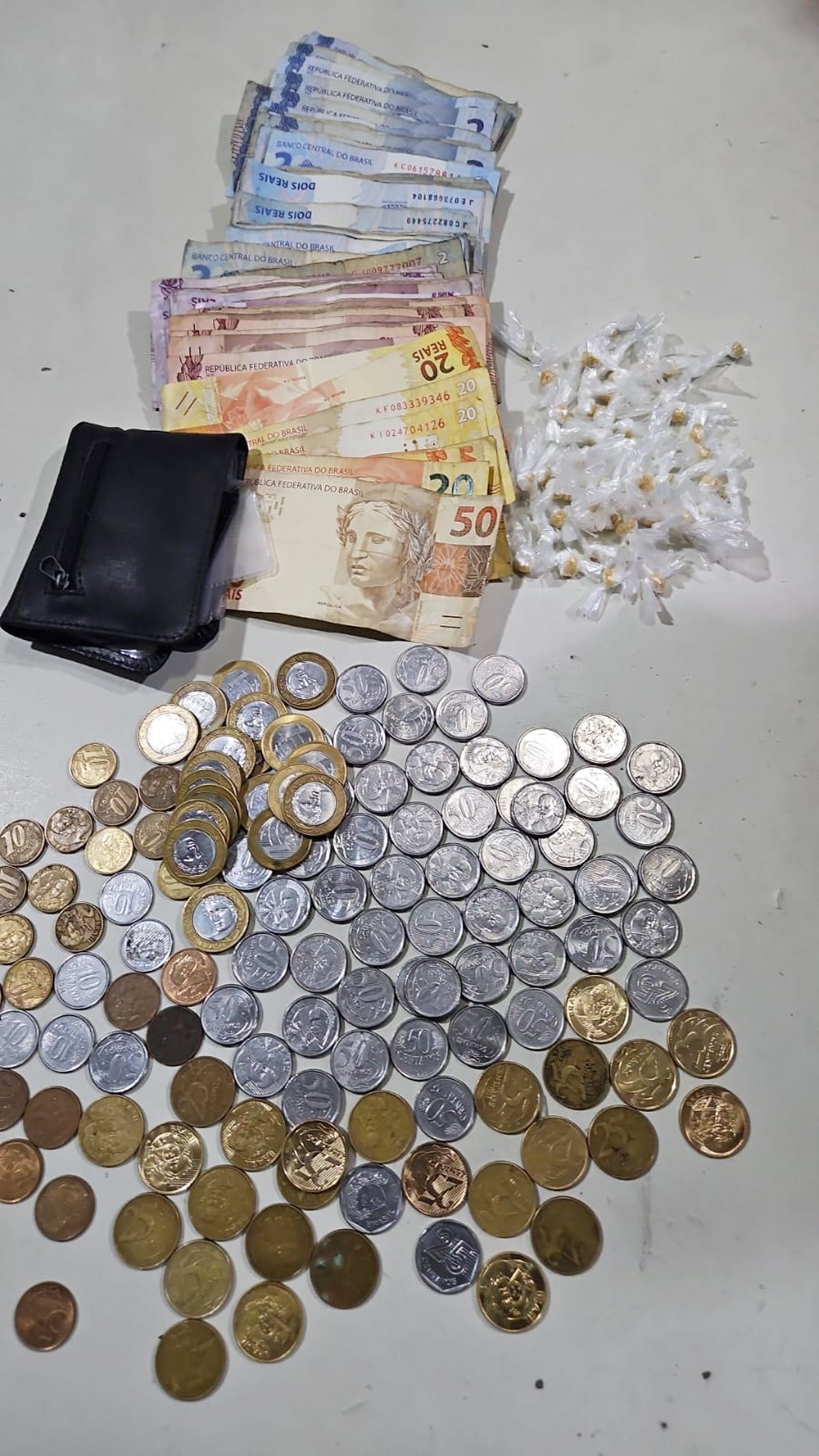 Durante a abordagem, os agentes localizaram uma sacola preta contendo 70 porções de uma substância semelhante a crack e a quantia de R$ 574,25 em espécie. Além disso, ao revistar a carteira porta-cédula do adolescente, foram encontradas mais 14 pedras de crack.