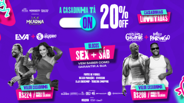 O público da Micarina, agora, pode garantir nos dois dias de folia nos blocos, pagando menos. Atendendo aos pedidos do público, a promoção Casadinha já está disponível e disponibiliza 20% de desconto no valor total da compra dos dois abadás para blocos de sexta e sábado.