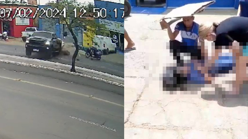 Câmeras de segurança registraram o momento em que a caminhonete atravessa o canteiro central e ocasiona o acidente. Nas imagens, é possível ver que o trânsito ocorre normalmente, quando a picape sai disparadamente de um estabelecimento, e atinge em cheio uma motocicleta, que por sua vez colide em uma Biz que passava no momento.