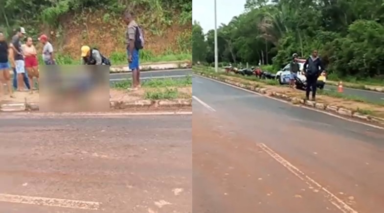 Imagens registradas por populares mostram a vítima caída no canteiro central da via, com o capacete ao lado do corpo. Informações iniciais apontam que o motociclista foi identificado como Álvaro.