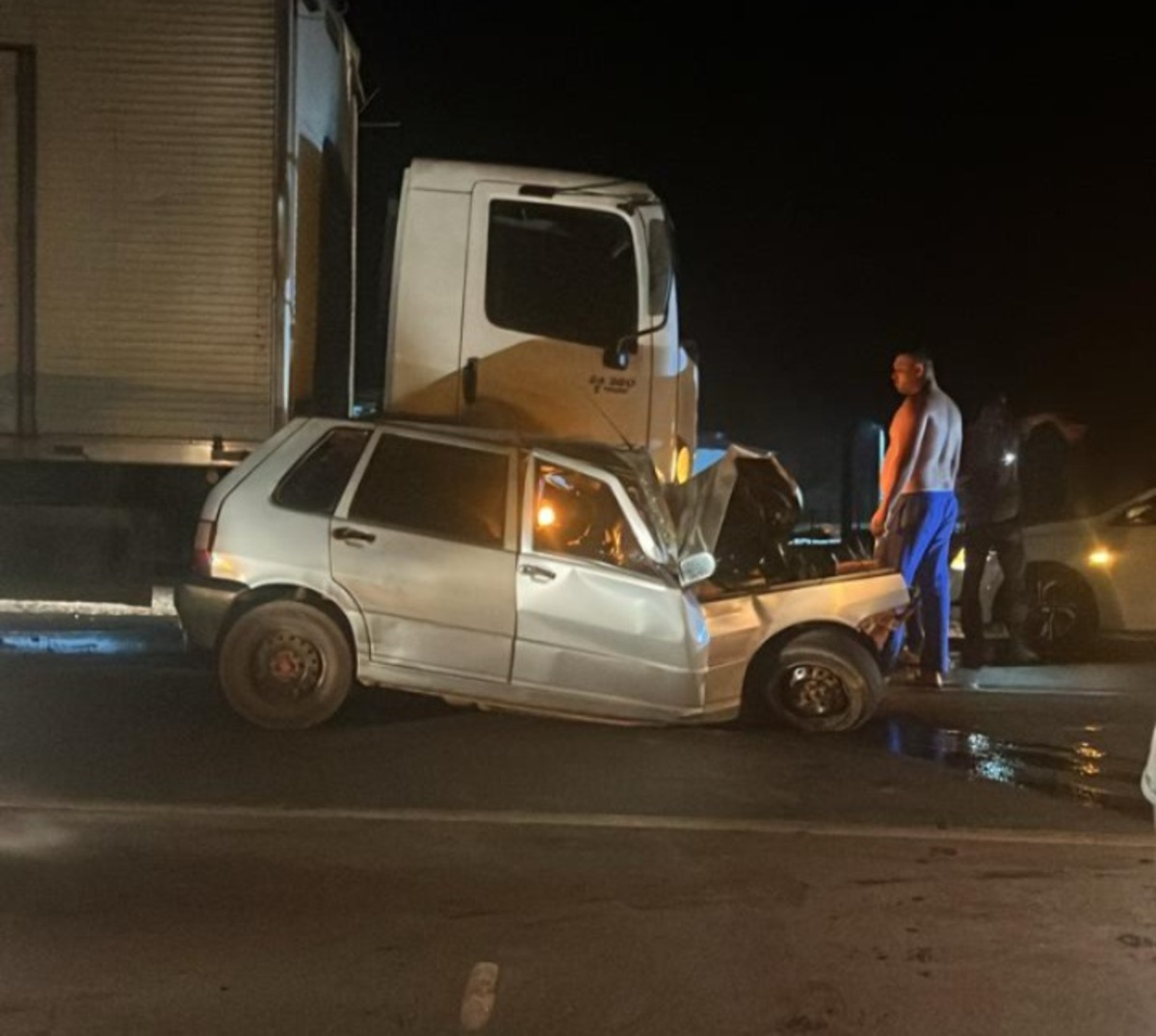 O condutor do caminhão escapou ileso e seu resultado do exame de alcoolemia deu negativoImagens divulgadas em grupos de WhatsApp mostram que a parte frontal do carro de passeio foi completamente destruída.