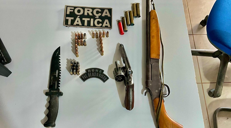Já durante o registro da ocorrência na Delegacia de Polícia, a vítima informou que o agressor possuía armas de fogo em casa. Com a autorização, os policiais retornaram à residência e localizaram o armamento. Foram apreendidos um revólver calibre .38, uma espingarda cartucheira calibre 28 e munições correspondentes a ambos os calibres.