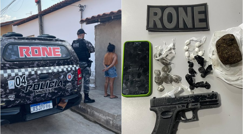 Segundo a ocorrência, a suspeita foi flagrada com uma porção de maconha, 10 trouxinhas da mesma droga, 15 trouxinhas de cocaína e um simulacro de arma de fogo. Também foi apreendido um celular Samsung com restrição de roubo.