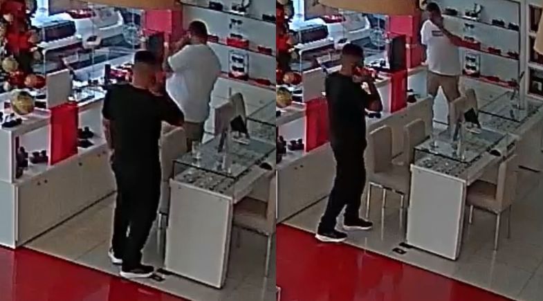 O caso ocorreu na manhã desta quarta-feira (3). Nas imagens é possível ver quando os suspeitos entram na loja por volta das 10h12. Um deles, vestindo blusa preta, inicia um atendimento com as vendedoras, enquanto o outro, usando uma camisa branca, aparentemente está somente acompanhando.