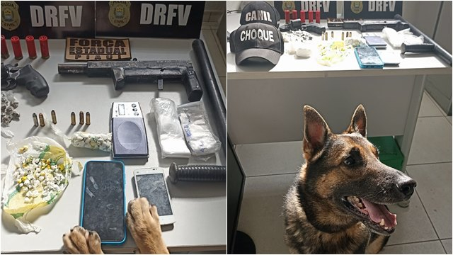 Foram apreendidos um revólver municiado, uma escopeta .12 artesanal com cinco munições, balança de precisão, maconha e cocaína