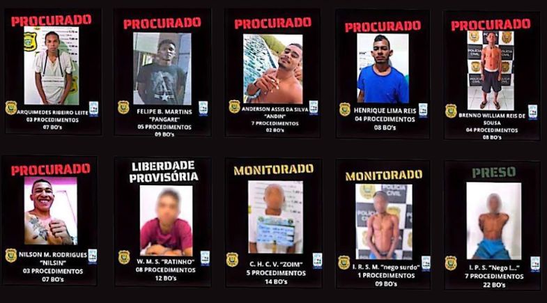 A delegacia divulgou imagens e informações de 24 investigados. Desse total, 15 estão presos, dois são monitorados, um está em liberdade provisória e seis seguem sendo procurados. Eles somam mais de 145 procedimentos policiais e registram mais de 300 Boletins de Ocorrência (BOs).