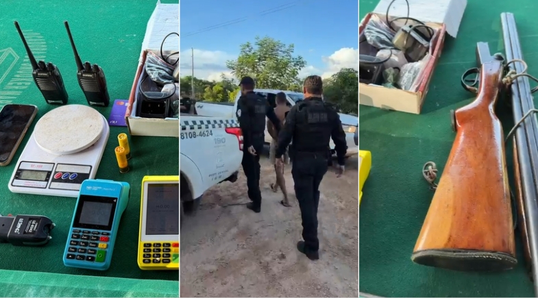 Durante a ação, foram apreendidos armas, balança de precisão comum, celular, maquininhas, dentre outros materiais.
