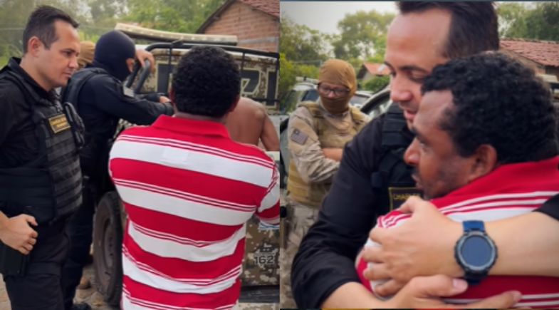 Emocionado, ele abraçou o delegado Charles Pessoa, da Delegacia de Repressão às Ações Criminosas Organizadas (DRACO), e reforçou que a polícia está fazendo o bem.