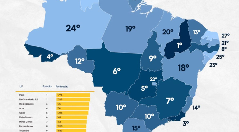 Logo atrás dos líderes, o Rio de Janeiro ocupa a 3ª posição (175 pontos), seguido de perto pelo Acre (174 pontos) e Goiás (170,5 pontos).
