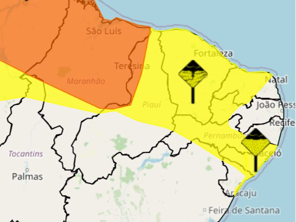 Já o alerta amarelo atinge o litoral do Piauí, além do restante do Norte e Centro-Norte do estado e parte do Sudeste piauiense. Nessa alerta, existe a possibilidade de chuvas entre 20 e 30 mm/h ou até 50 mm/dia e ventos intensos de 40 a 60 km/h.