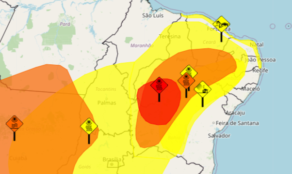 Para as áreas do Sudeste Piauiense e Sudoeste Piauiense, o alerta vermelho entrou em vigor às 14h de hoje. Nesse cenário, a umidade relativa do ar ficará abaixo de 12%, representando um grande risco de incêndios florestais e graves impactos à saúde, como doenças pulmonares e dores de cabeça.