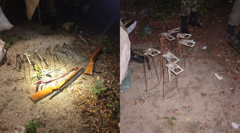 Durante a diligência, realizada na área indicada pela denúncia, os policiais encontraram 11 espingardas artesanais do tipo “buraco”, comumente usadas na captura de tatu, além de duas espingardas caseiras do tipo bate-bucha. Também foram apreendidos chumbo, cartucho calibre .32, pólvora e uma arma branca.