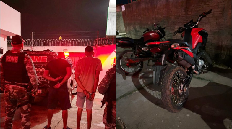 Durante a varredura no imóvel, os policiais localizaram dois homens, identificados pelas iniciais K.R.A., de 20 anos, e I.A.A., além de três motocicletas e diversos objetos de procedência duvidosa. Os materiais apreendidos incluem: