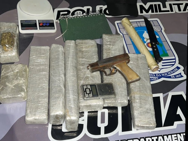 Foram apreendidos sete tabletes de skunk, arma de fogo e uma balança de precisão. Todo o material foi encaminhado à Central de Flagrantes.