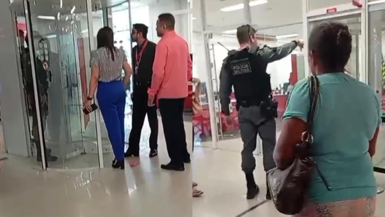 Em tom autoritário, ele ordenou que o segurança e o gerente o acompanhassem, afirmando que ambos seriam conduzidos pelos policiais.