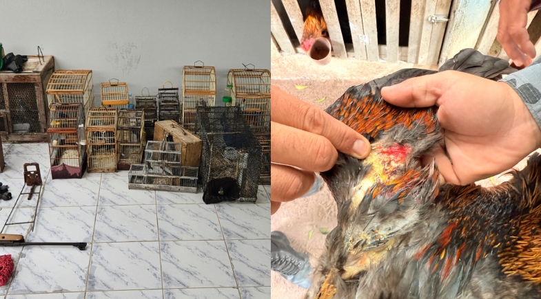 Uma operação composta pela Polícia Militar e Polícia Civil cumpriu um mandado de busca e apreensão domiciliar que resultou na apreensão de 36 animais, entre eles 20 cabeças-vermelhas, 6 azulões, 1 papa-capim, 1 galo-de-campina e 8 galos com sinais claros de envolvimento em rinhas, como ausência de penas no pescoço, cicatrizes e uso de esporas artificiais.