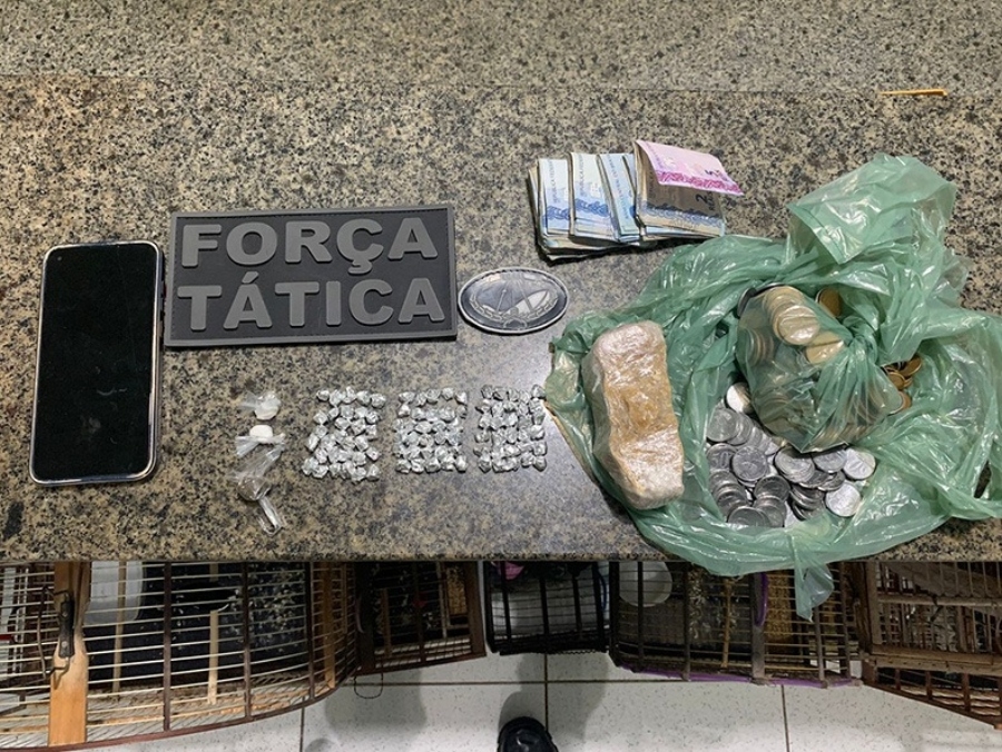 O QUE FOI APREENDIDO – Durante as buscas feitas na casa abandonada que era usada como ponto de venda de drogas, foram encontradas 90 pedras de crack, 01 porção grande de crack, 02 invólucros de cocaína, 01 porção de maconha, R$ 244,30 em espécie e pássaros silvestres em gaiolas.